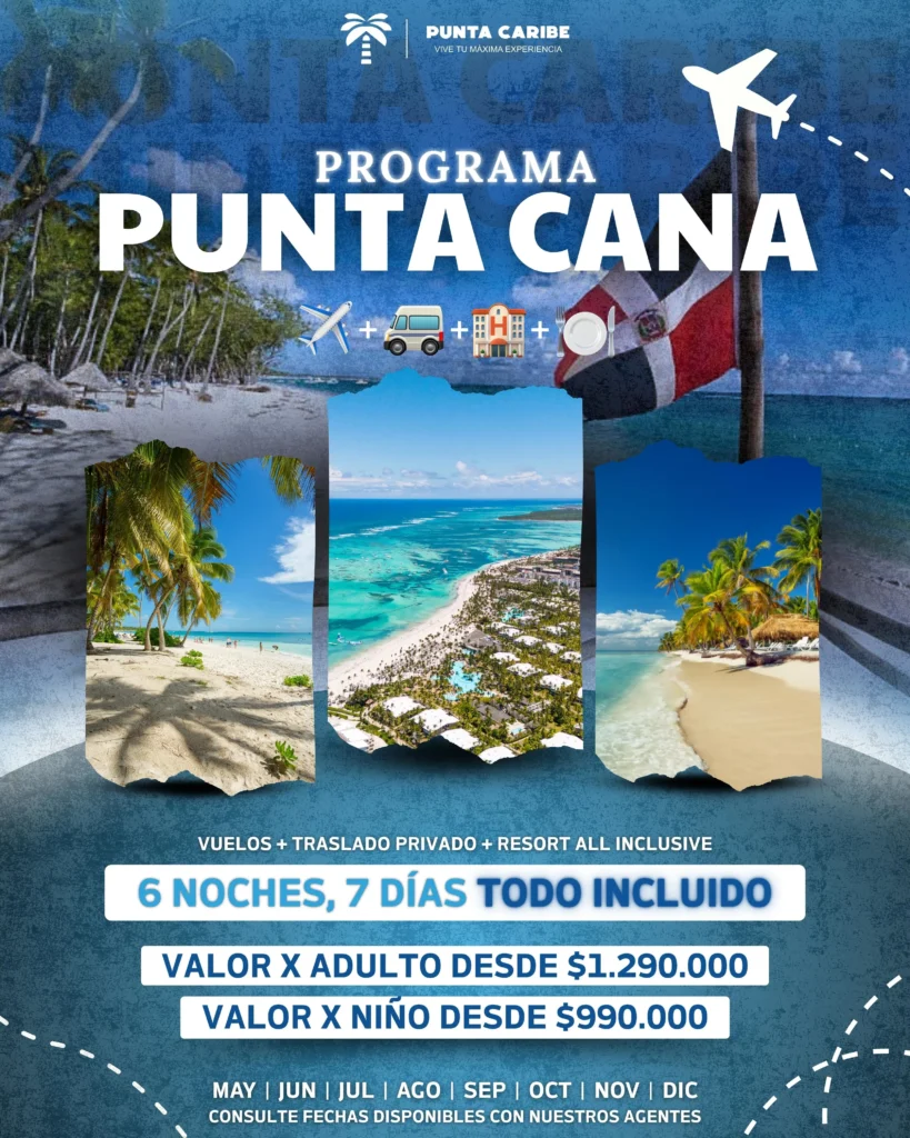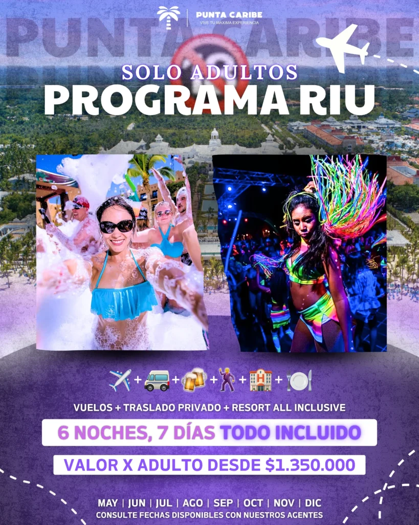 Disfruta unas vacaciones inolvidables con el Programa Riu Solo Adultos en Punta Cana 🌴✈️. Incluye vuelos ida y vuelta desde Santiago, traslado privado, 6 noches...