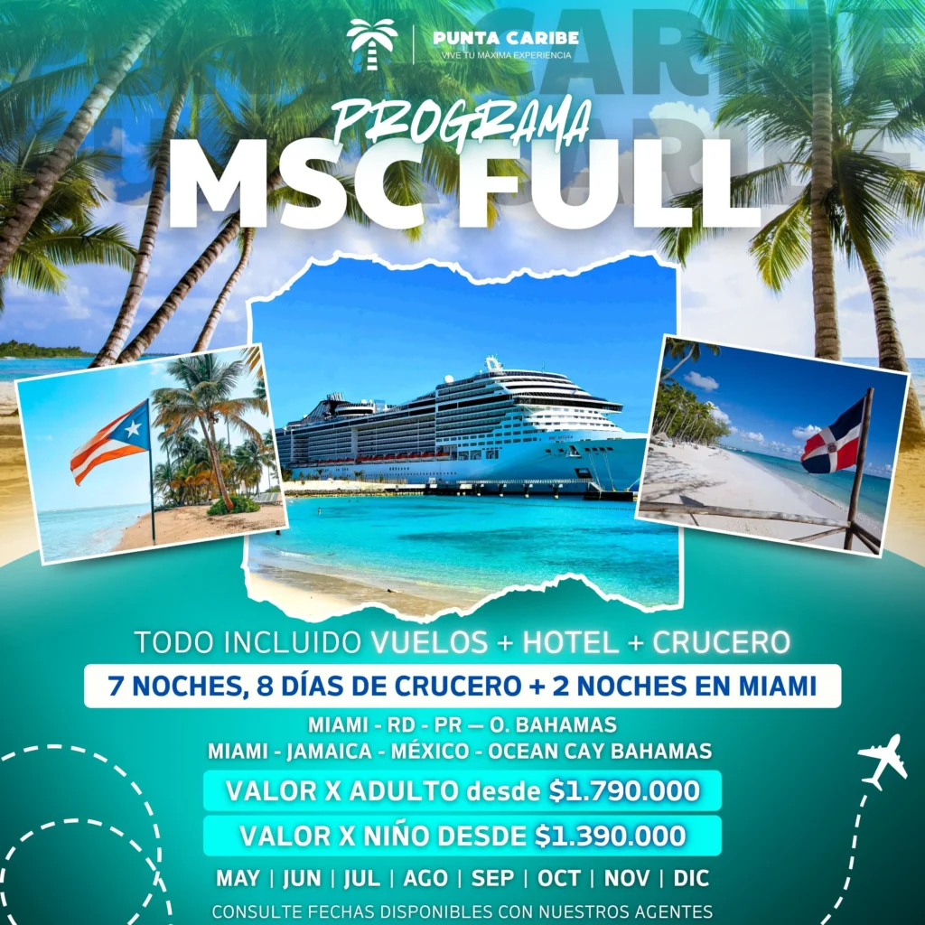 ¡Disfruta una escapada inolvidable con nuestro Programa MSC 🛳️ Incluye vuelos, hotel en Miami y un espectacular crucero por el Caribe. Vive 7 días y...